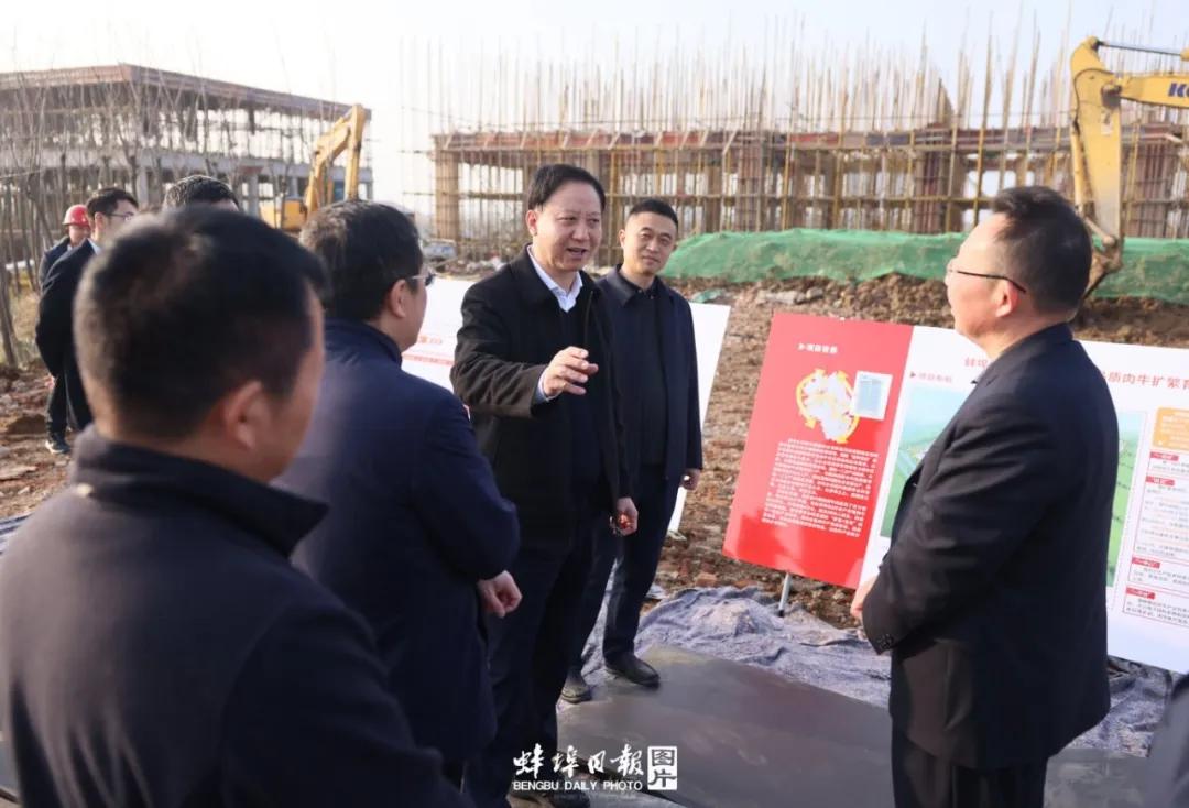 黃曉武書(shū)記現(xiàn)場(chǎng)察看施工進(jìn)度,詳細(xì)了解項(xiàng)目進(jìn)度、規(guī)劃設(shè)計(jì)等情況,陳建功董事長(zhǎng)對(duì)項(xiàng)目建設(shè)和后期運(yùn)營(yíng)有關(guān)問(wèn)題進(jìn)行詳細(xì)介紹。黃書(shū)記對(duì)該項(xiàng)目建設(shè)表示充分肯定,強(qiáng)調(diào)要進(jìn)一步加快建設(shè)進(jìn)度,優(yōu)化運(yùn)營(yíng)模式,積極探索聯(lián)農(nóng)帶農(nóng)新模式,發(fā)展“智慧+生態(tài)”一體化肉牛養(yǎng)殖體系,要把鄉(xiāng)村產(chǎn)業(yè)發(fā)展擺在更加突出位置,下更大功夫抓好“糧頭食尾”“畜頭肉尾”“農(nóng)頭工尾”增值大文章,充分發(fā)揮蚌埠優(yōu)勢(shì),深入實(shí)施“秸稈變?nèi)狻濒呷馀U衽d計(jì)劃,加強(qiáng)高品質(zhì)肉牛繁、育、加全產(chǎn)業(yè)鏈建設(shè),加快肉牛產(chǎn)業(yè)轉(zhuǎn)型升級(jí),為鄉(xiāng)村振興提供有力產(chǎn)業(yè)支撐。
