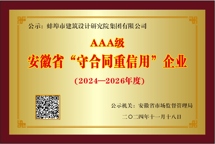 2024年11月18日,蚌埠市建筑設(shè)計研究院集團有限公司榮獲安徽省AAA級“守合同重信用”企業(yè)稱號。