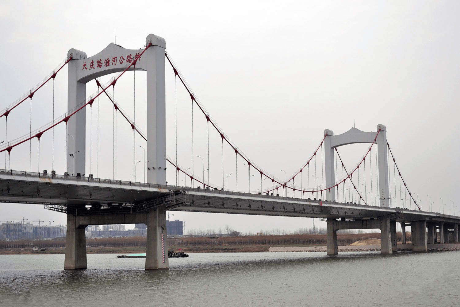 蚌埠市大慶路淮河公路橋于2009年12月開建,工期為3年,是蚌埠第三座淮河大橋,工程投資總概算達(dá)6.87億元。全線將設(shè)互通立交一處,采用雙向六車道設(shè)計(jì),并設(shè)置非機(jī)動(dòng)車道和人行道,設(shè)計(jì)速度60公里/小時(shí)。主橋采用雙塔雙索面自錨式懸鎖結(jié)構(gòu),路橋全長2.38公里,其中主橋長1778米,兩端接線602米,南岸設(shè)有四層八向互通立交,是淮河上第一座自錨式懸鎖橋。